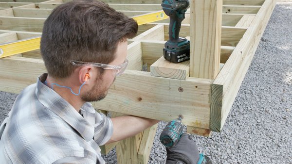 Insert the fasteners through the joists and into the blocking. Make sure the head of the fastener indents into the lumber and is flush with the outside edge of the joist.