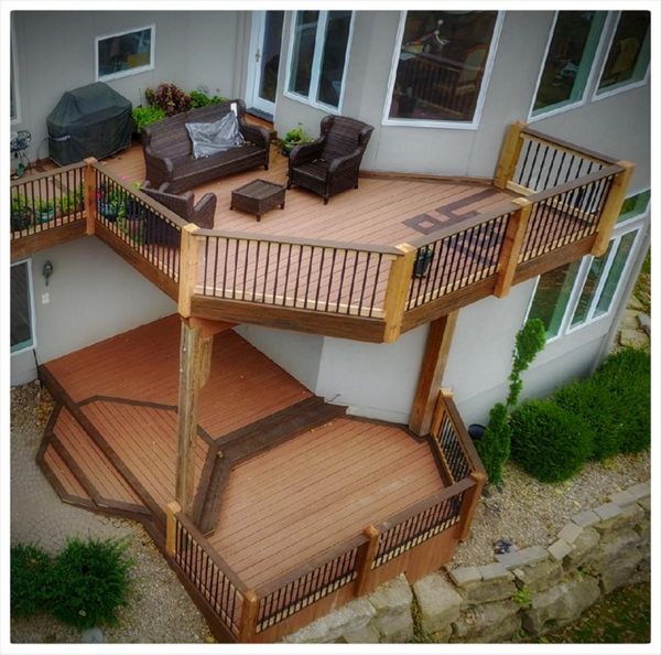 Trex Rope Swing decking with Spiced Rum Accent. Glass Aluminum railing