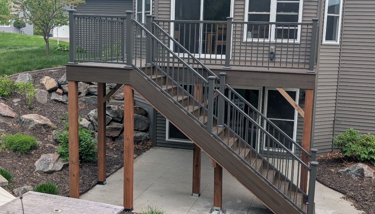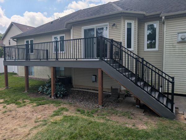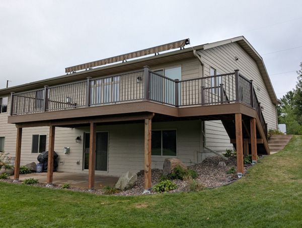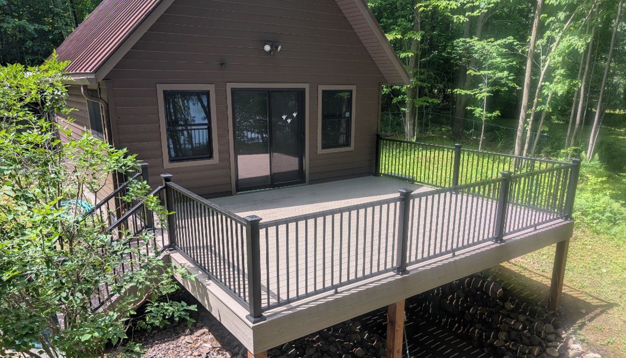 Trex composite lineage decking, Biscayne in color, aluminum railing.