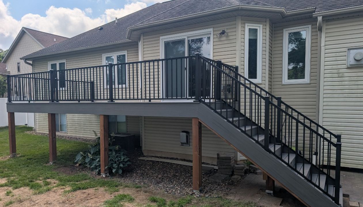 Trex composite tropicals island mist in color, aluminum railing white with black spindles