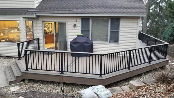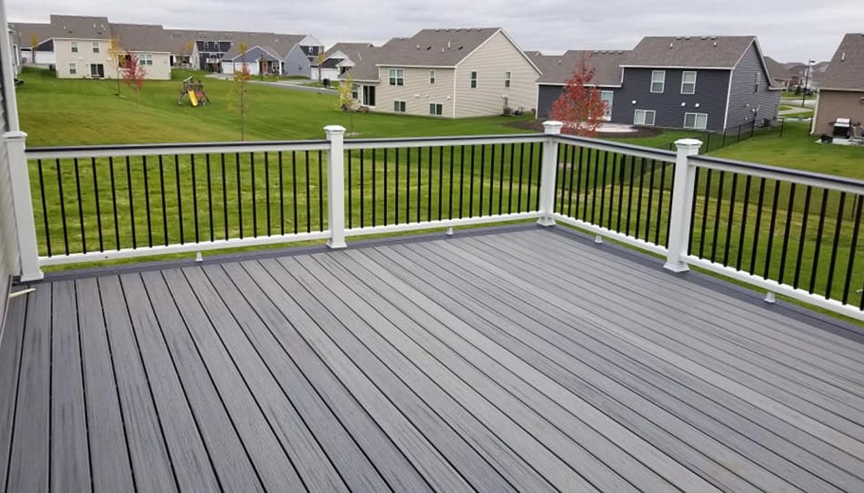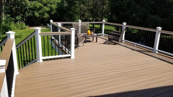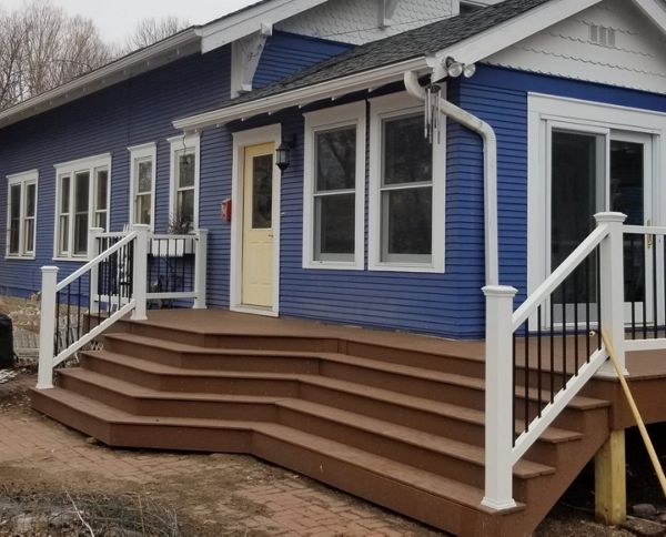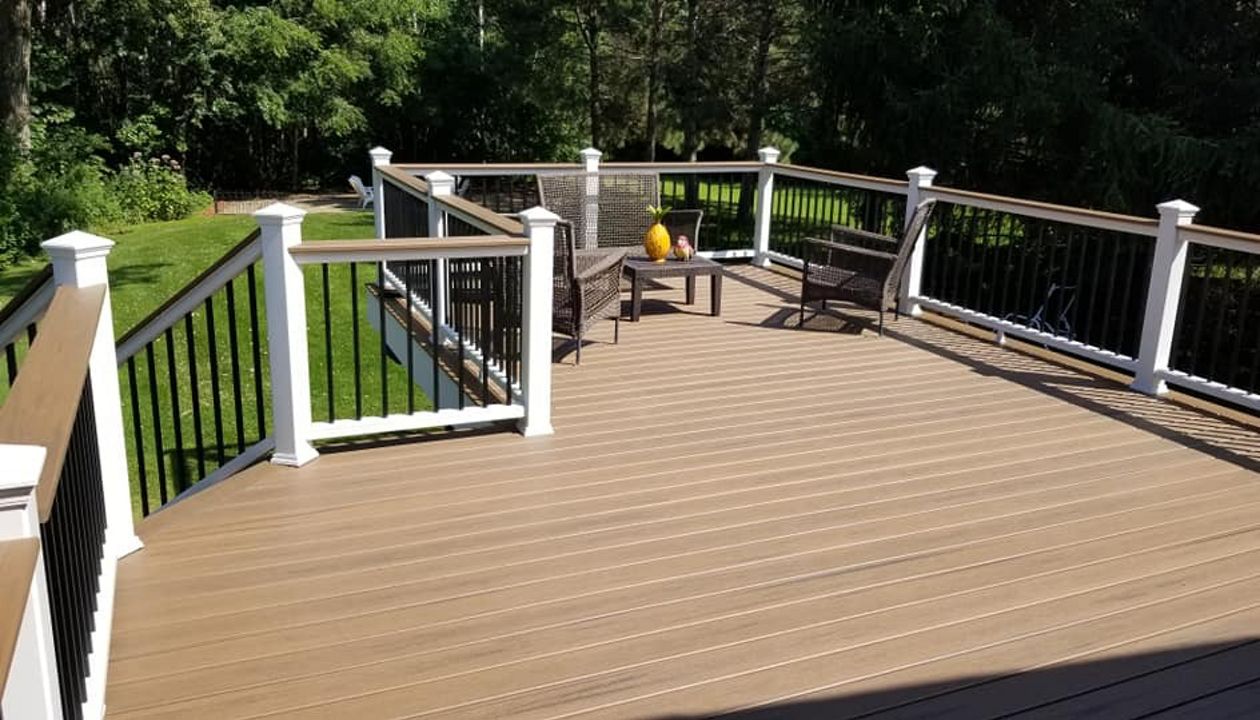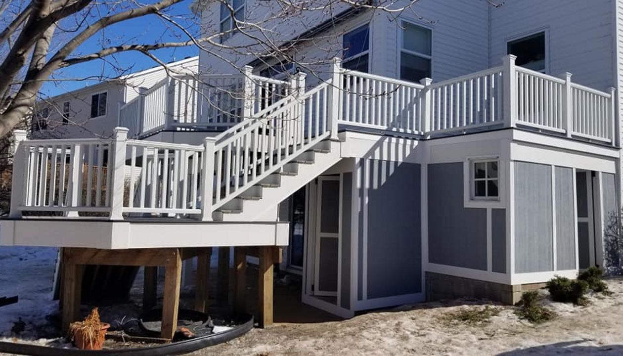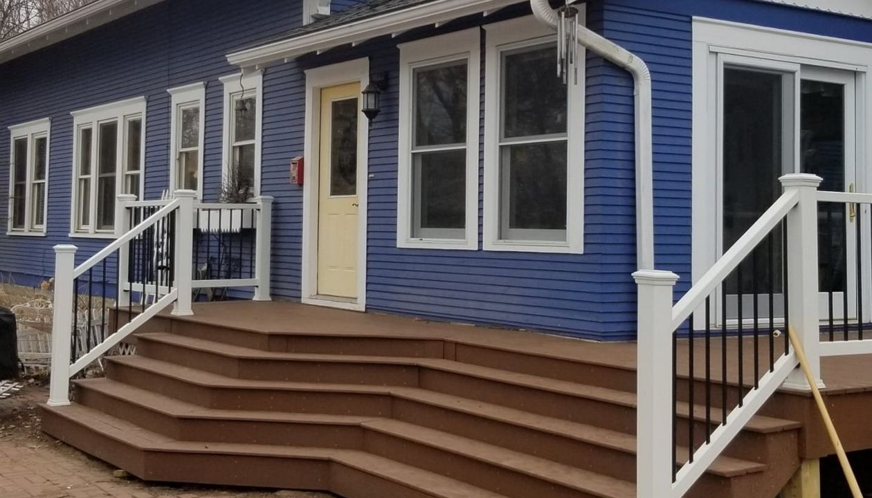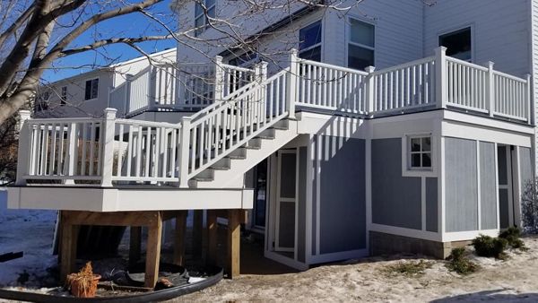 Trex Transcend Tropics Tiki Torch deck boards with Transcend crown railing (classic white rails with tree house balusters), Classic white fascia serving the Twin Cites, Hastings, Woodbury, Egan, Edina, Minneapolis, Lake of the Isles