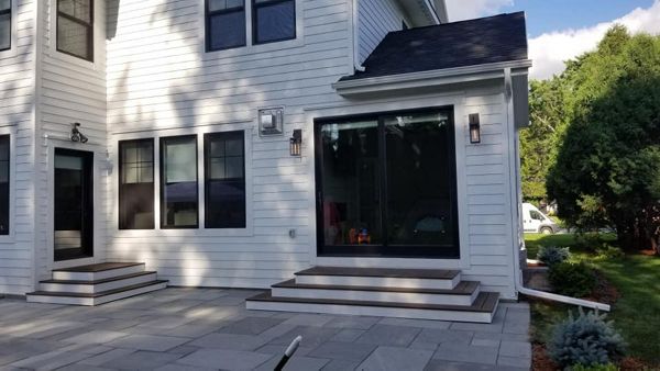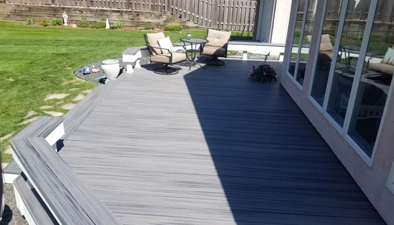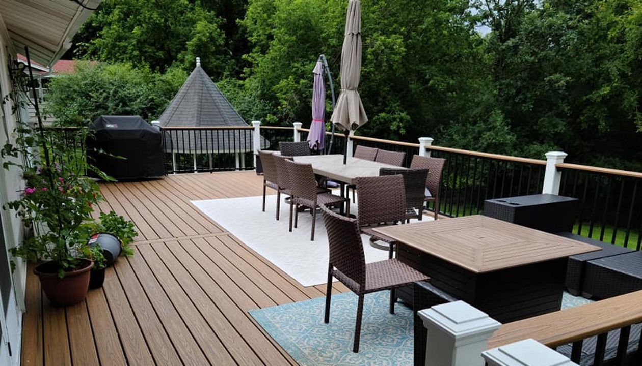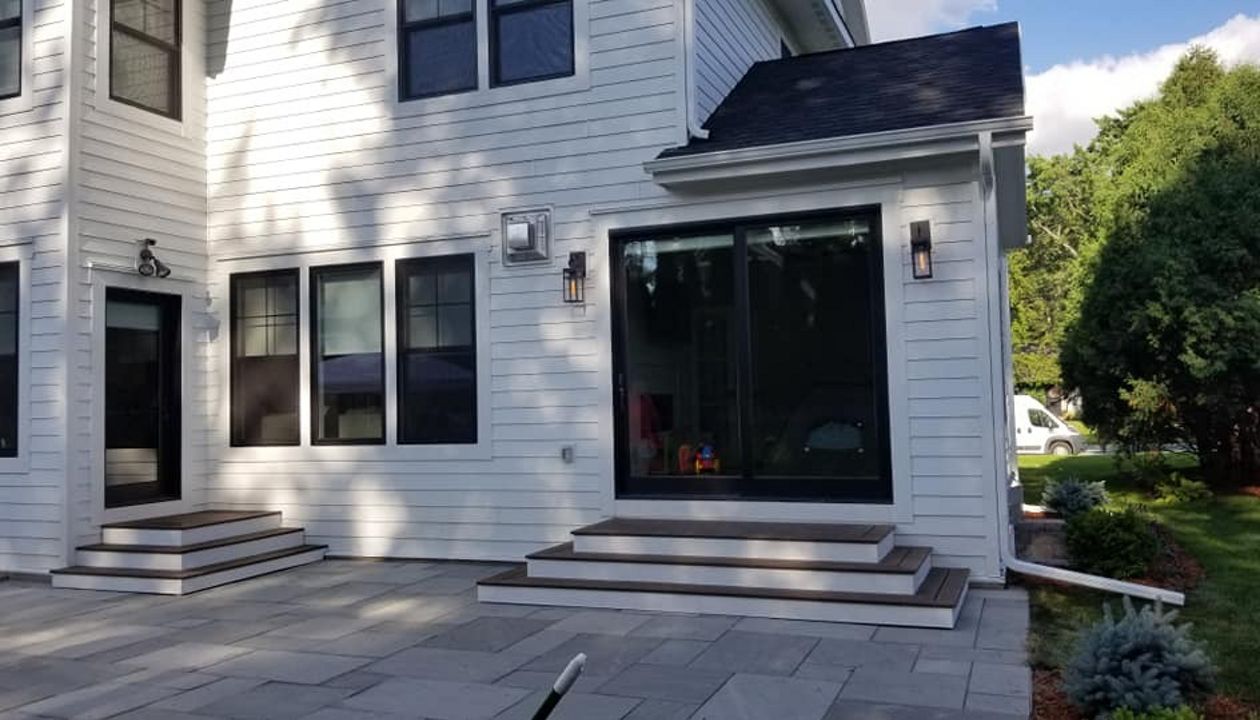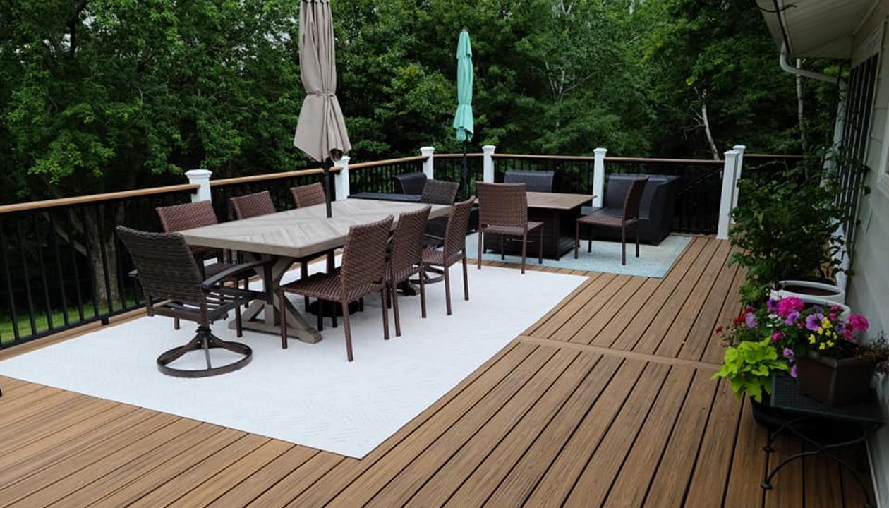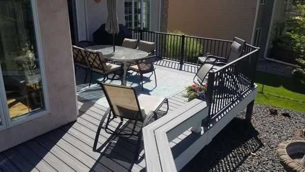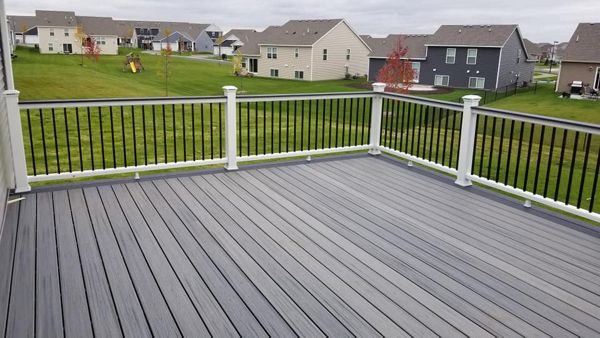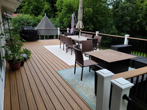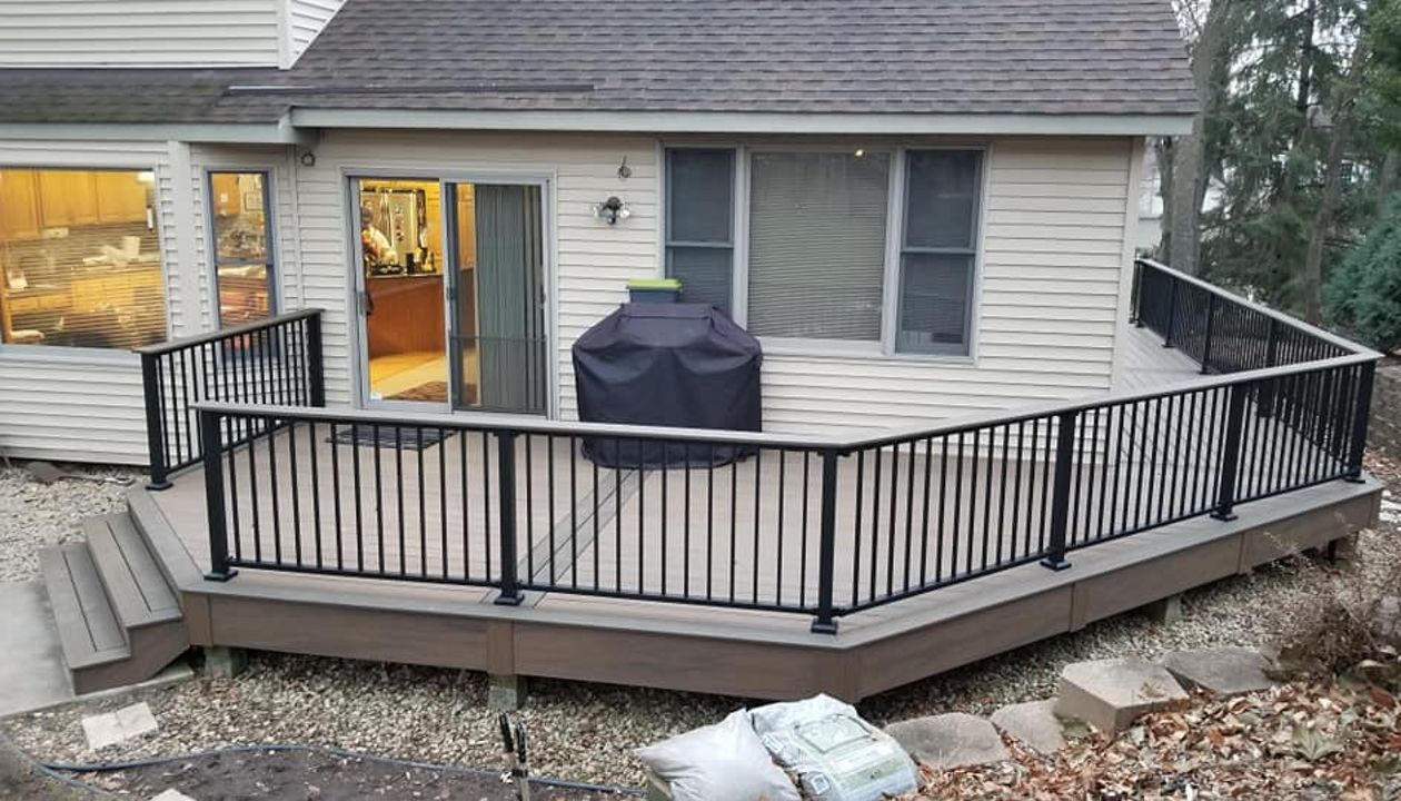 Trex Transcend Tropics Tiki Torch deck boards with Transcend crown railing (classic white rails with tree house balusters), Classic white fascia serving the Twin Cites, Hastings, Woodbury, Egan, Edina, Minneapolis, Lake of the Isles
