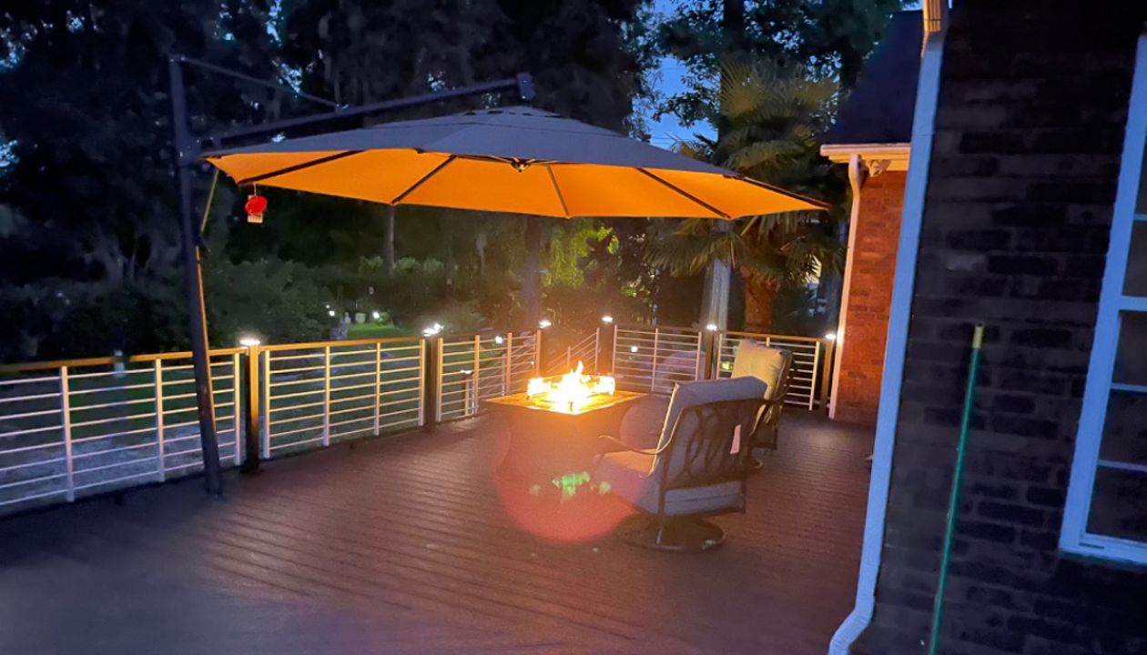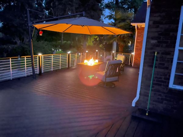 Trex Island Mist, universal rail with Trex Rail top, Black round balusters, cap lights, up lights, riser lights